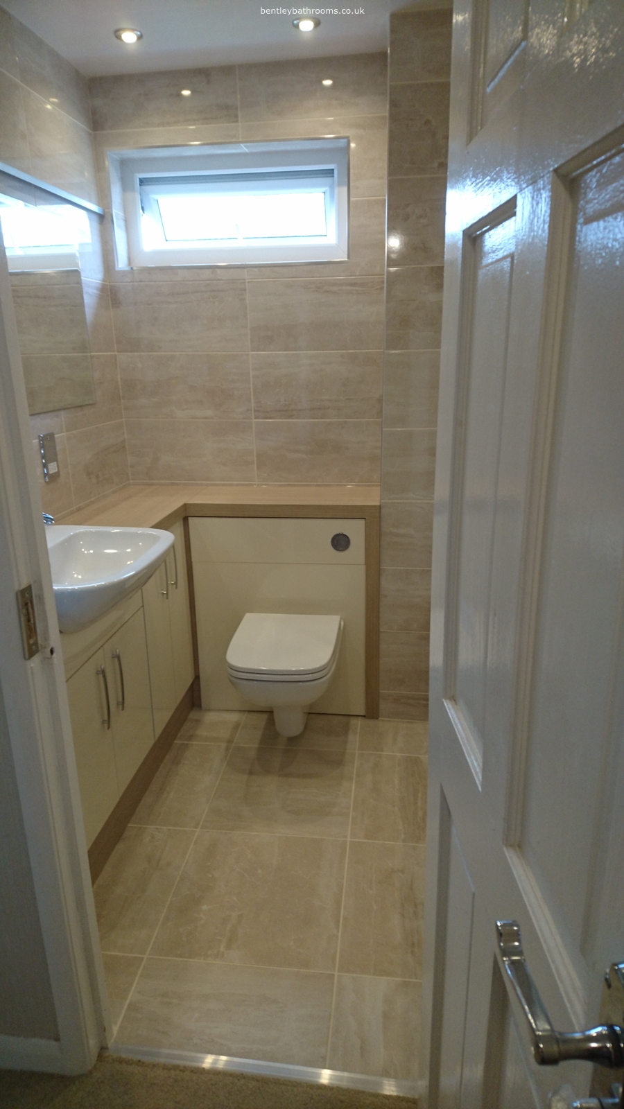 Full bathroom installation including bath with shower and glass screen, bathroom cabinets with hung-toilet and inset basin, mirror with LED strip mood lighting, chrome shaving point, heated towel rail, wall and floor tiling, upvc suspended ceiling with downlights, accessories, and all associated plumbing, electrics and joinery.
