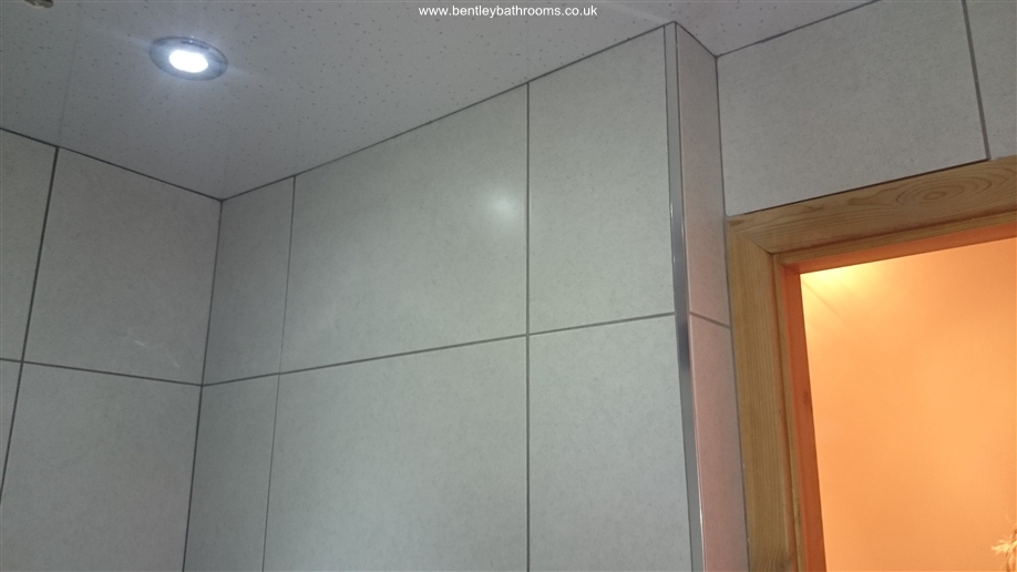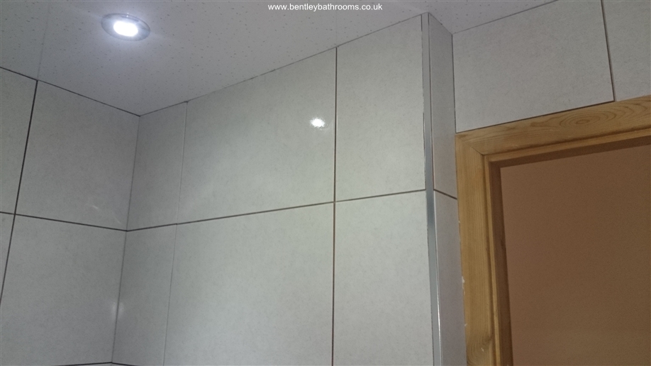 Full shower-room installation including UPVC ceiling with down-lights, full walls and floor tiling, chrome taps, trims and accessories, and all associated joinery, plumbing and electrics.