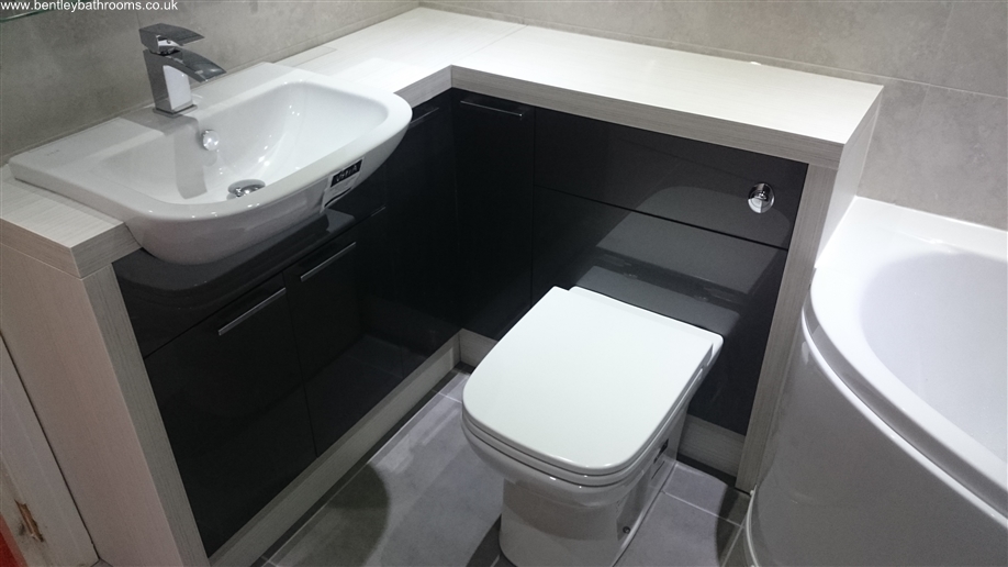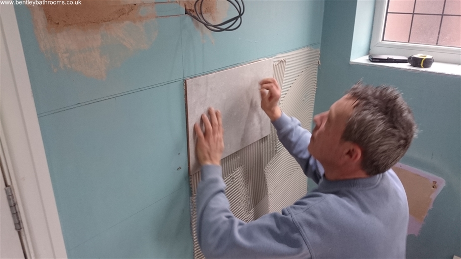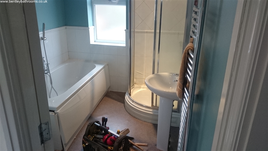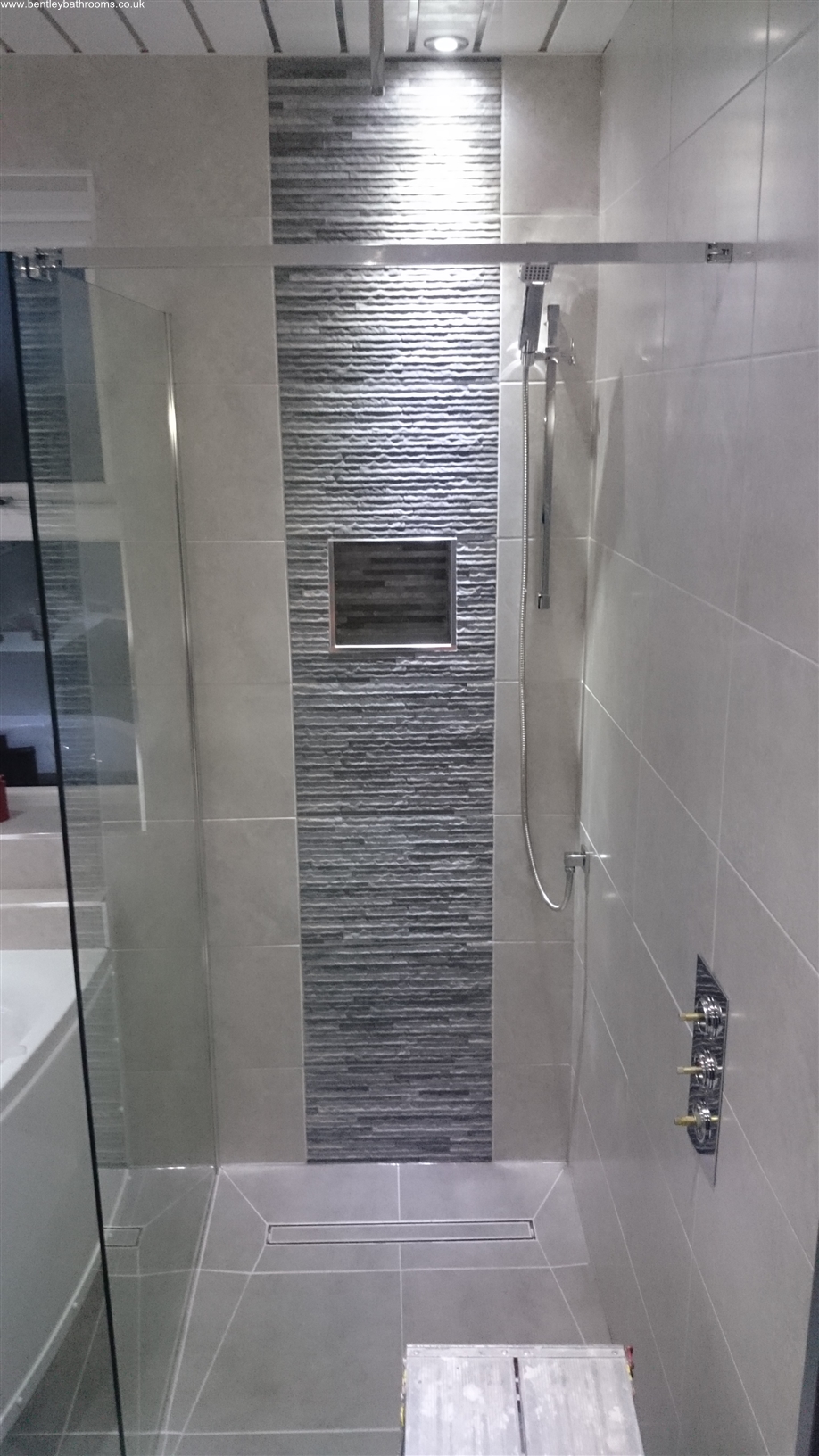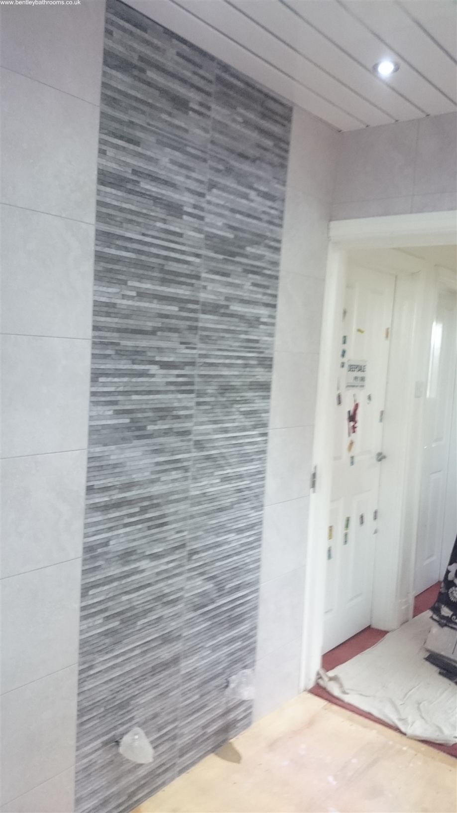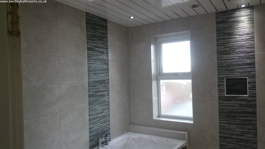 Full wet-room installation including wall and floor tiling, upvc ceiling with downlights, and all associated plumbing, electrics and joinery.