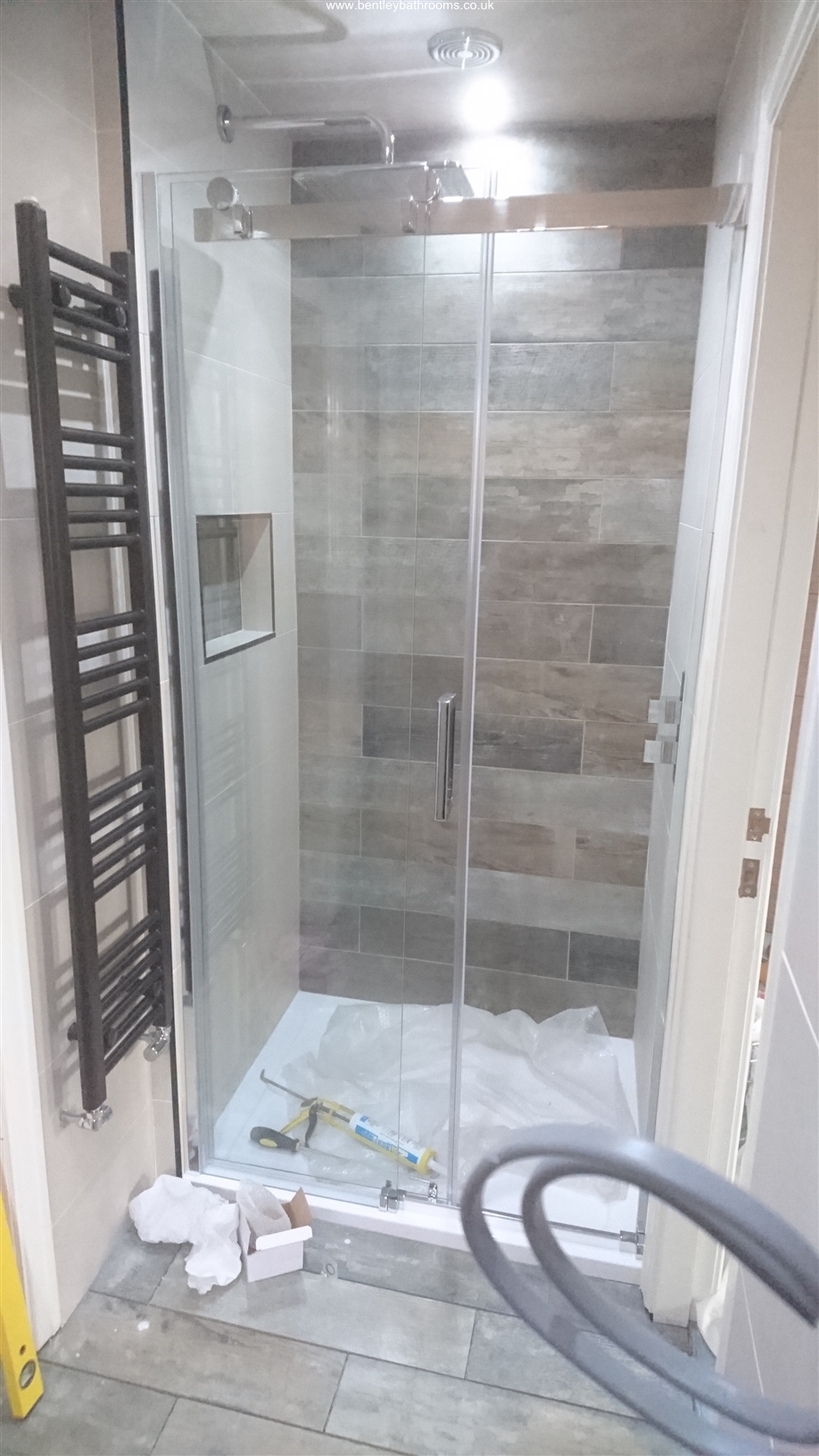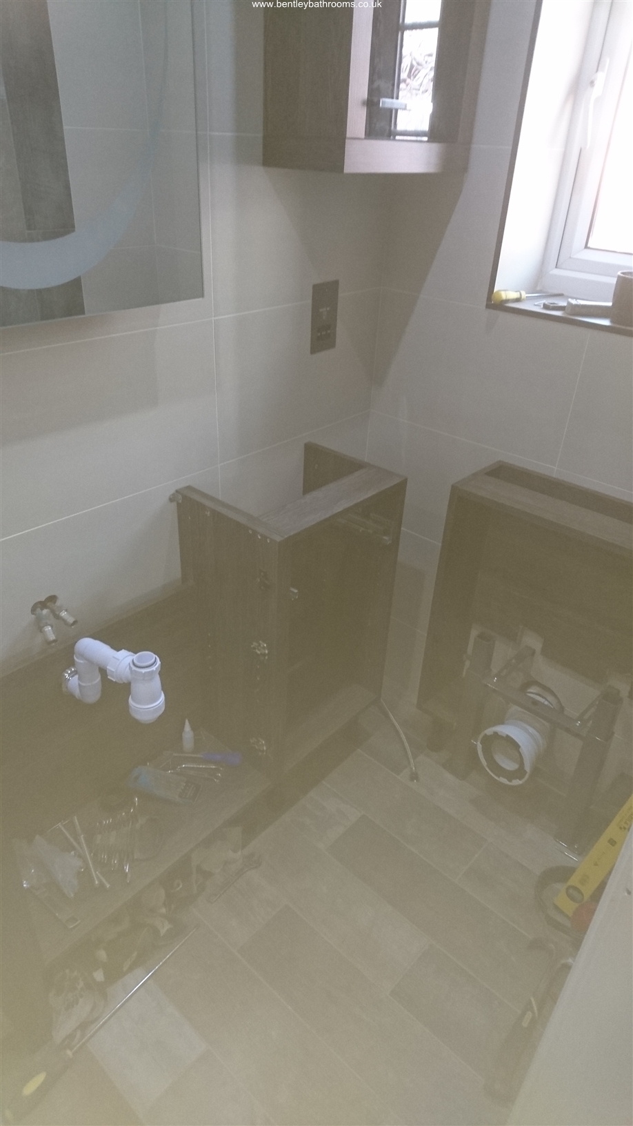 Full en-suite shower room installation including fitted bathroom cabinets with basin and wall-hung toilet, illuminated mirror, heated towel rail, shower, wall and floor tiling, upvc suspended ceiling with downlights, and all associated plumbing, electrics and joinery.
