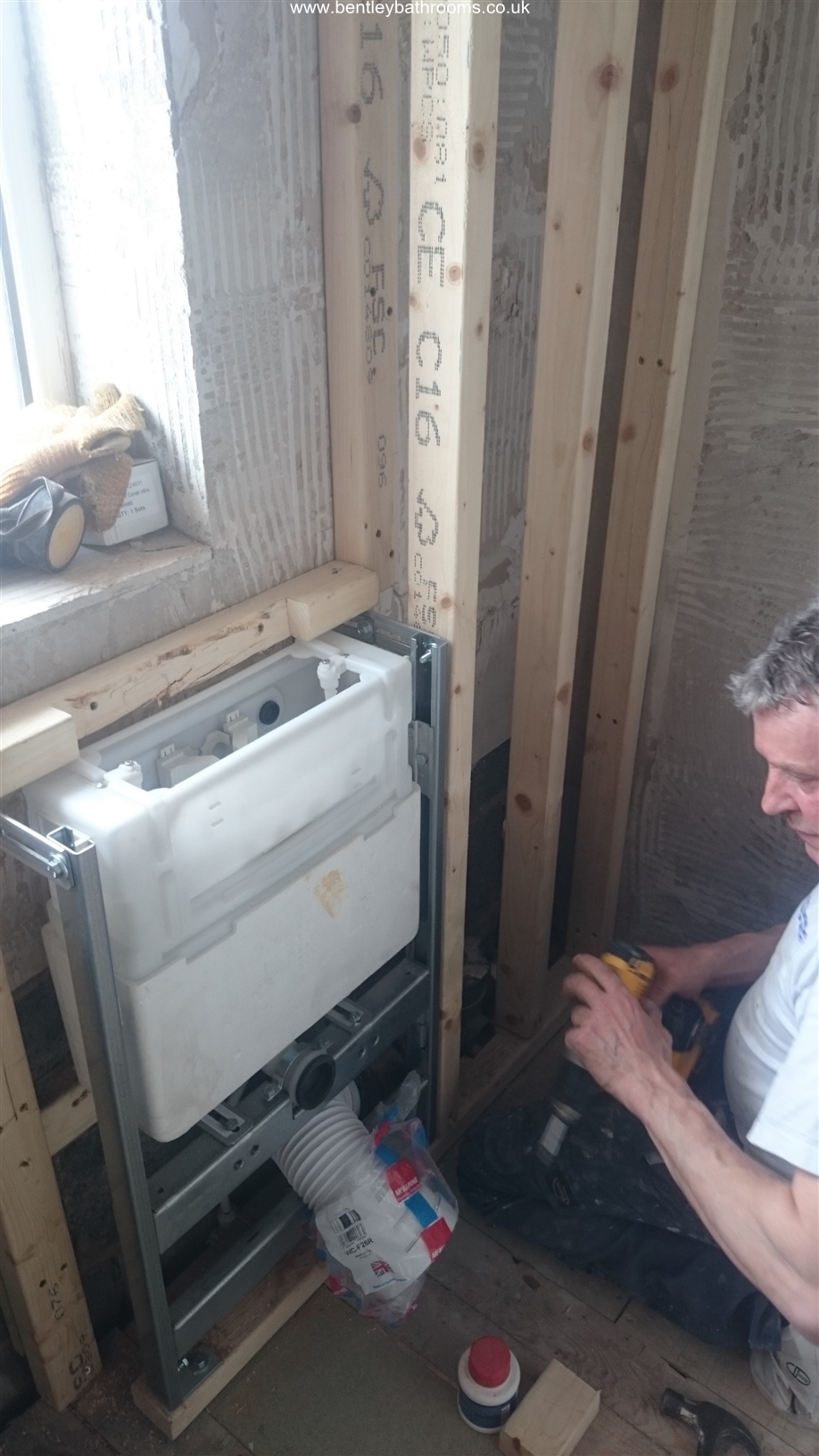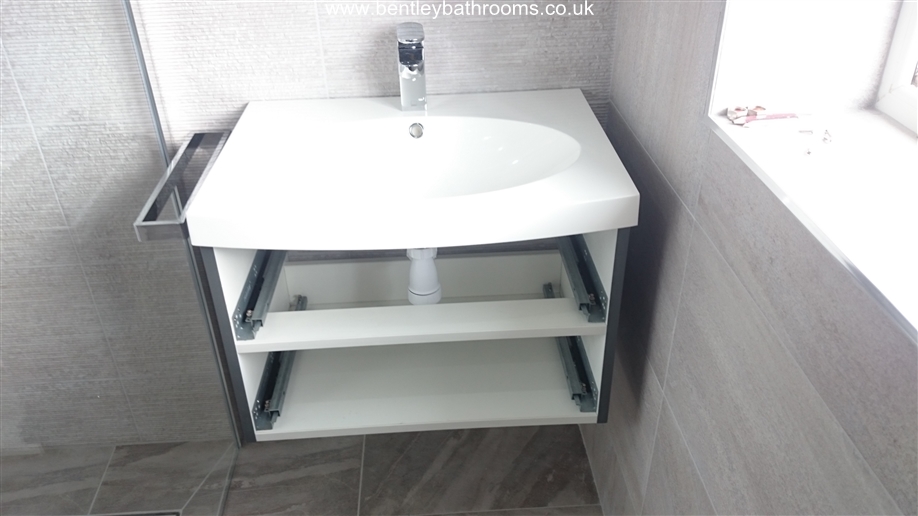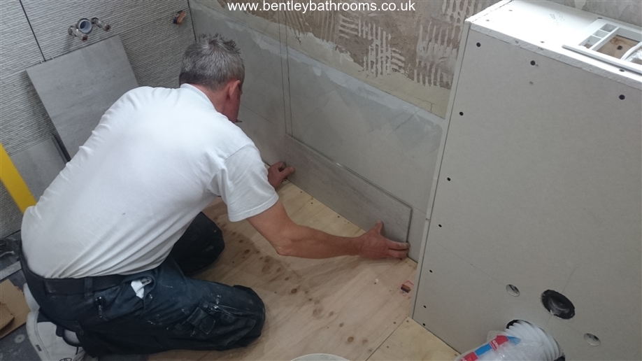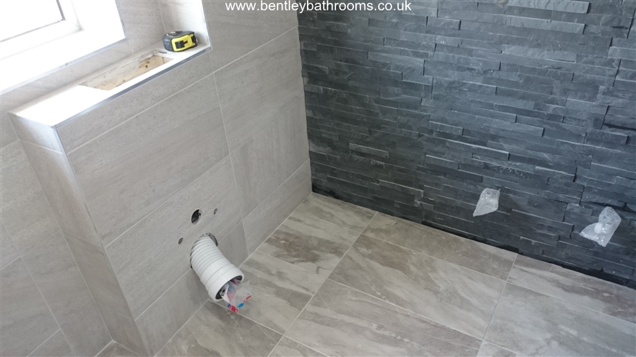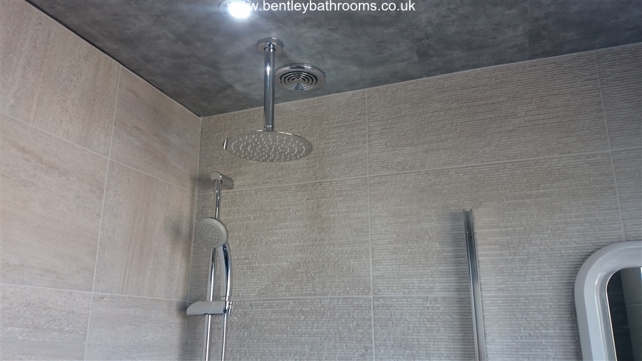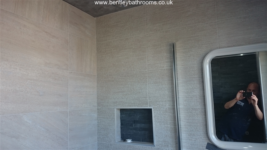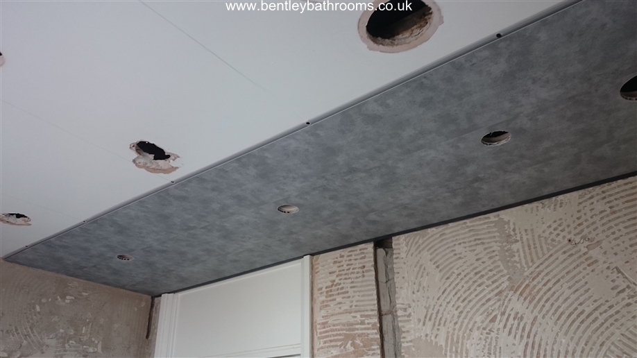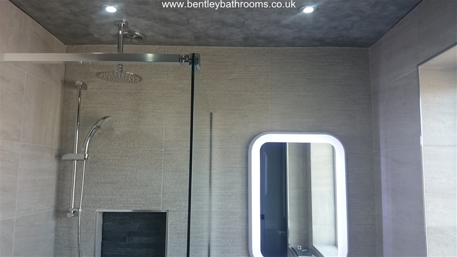 Full wet room installation including wall-hung vanity basin, toilet and tall cabinet, illuminated mirror, heated towel rail, wall and floor tiling, mosiac tiled feature wall with LED strip mood lighting, upvc suspended ceiling with downlights, accessories, and all associated plumbing, electrics and joinery.