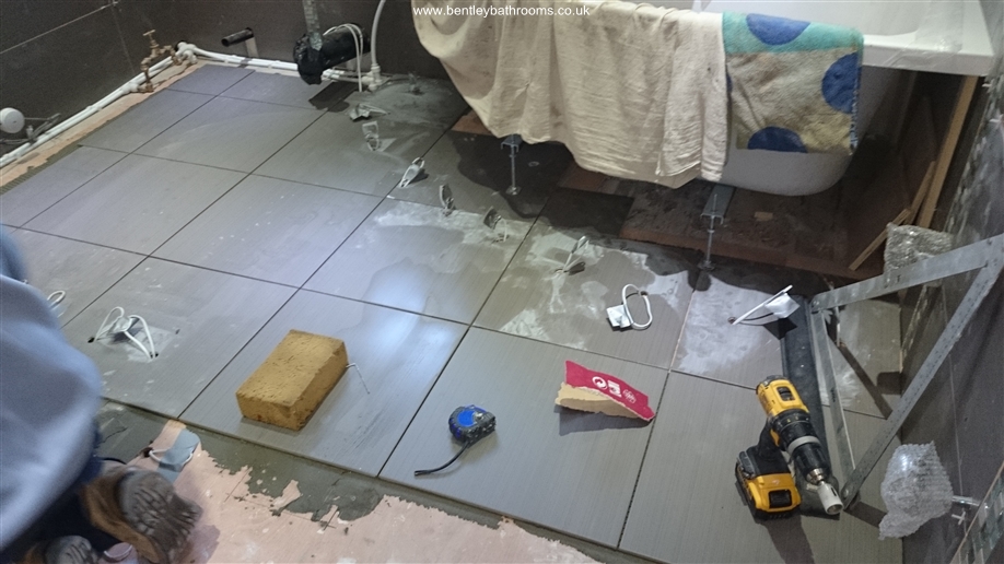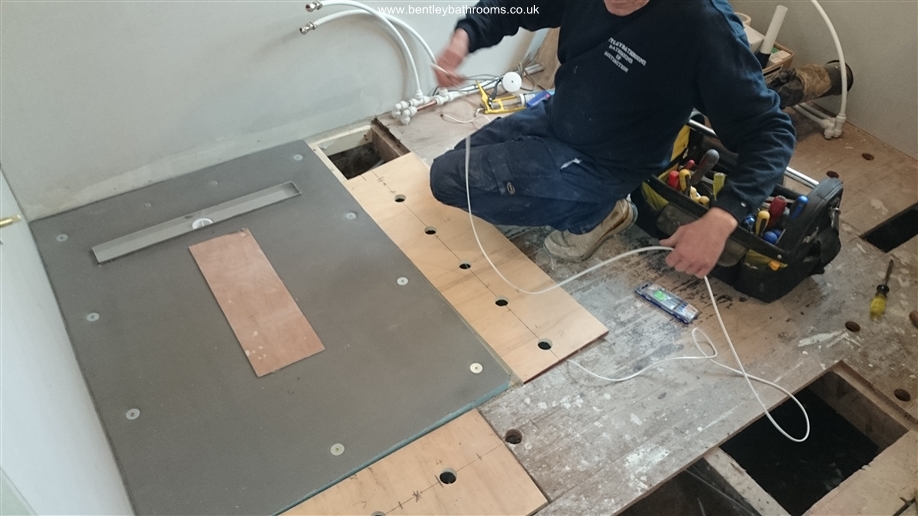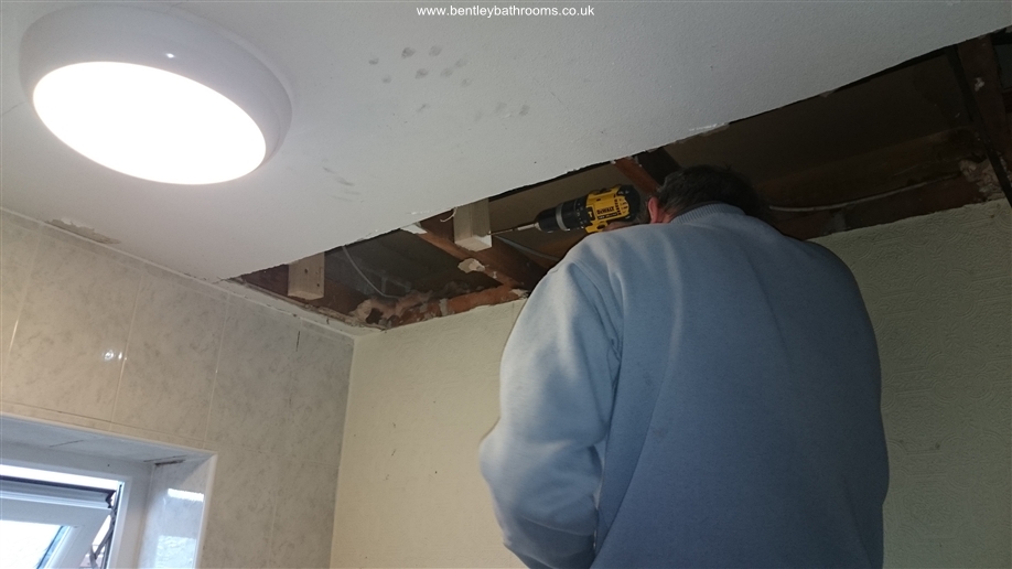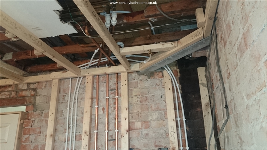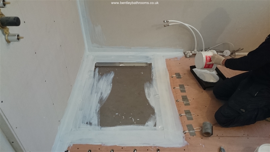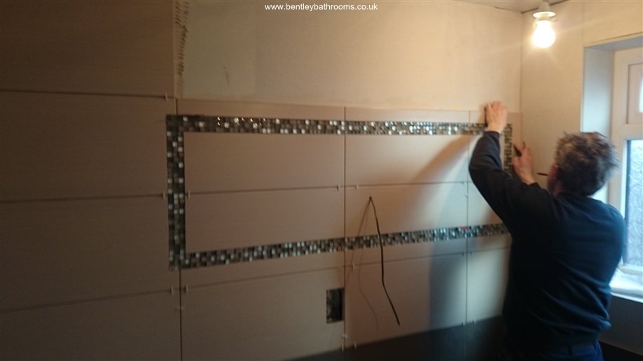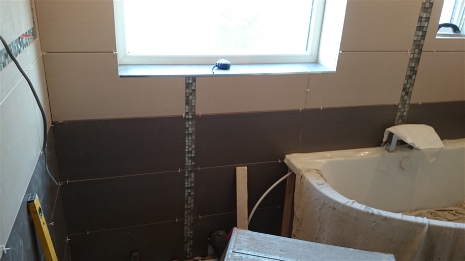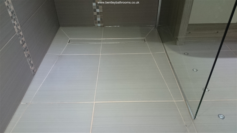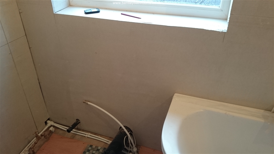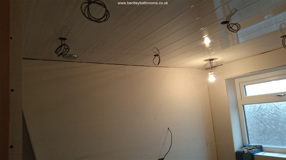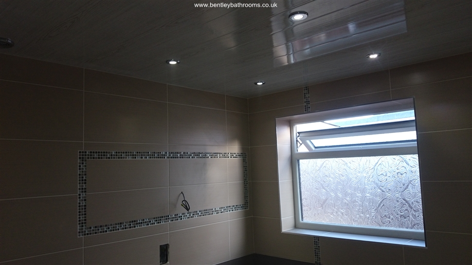 Full wet-room installation including UPVC ceiling with down-lights, full walls and floor tiling, chrome taps, trims and accessories, and all associated joinery, plumbing and electrics.