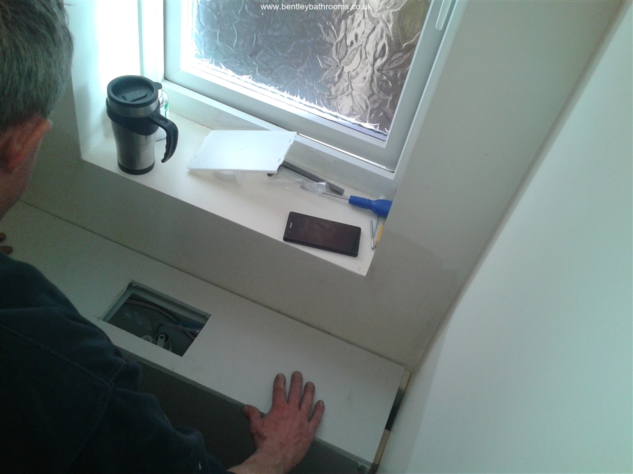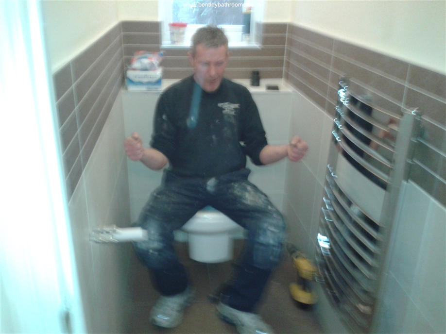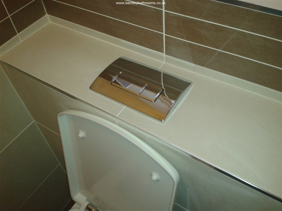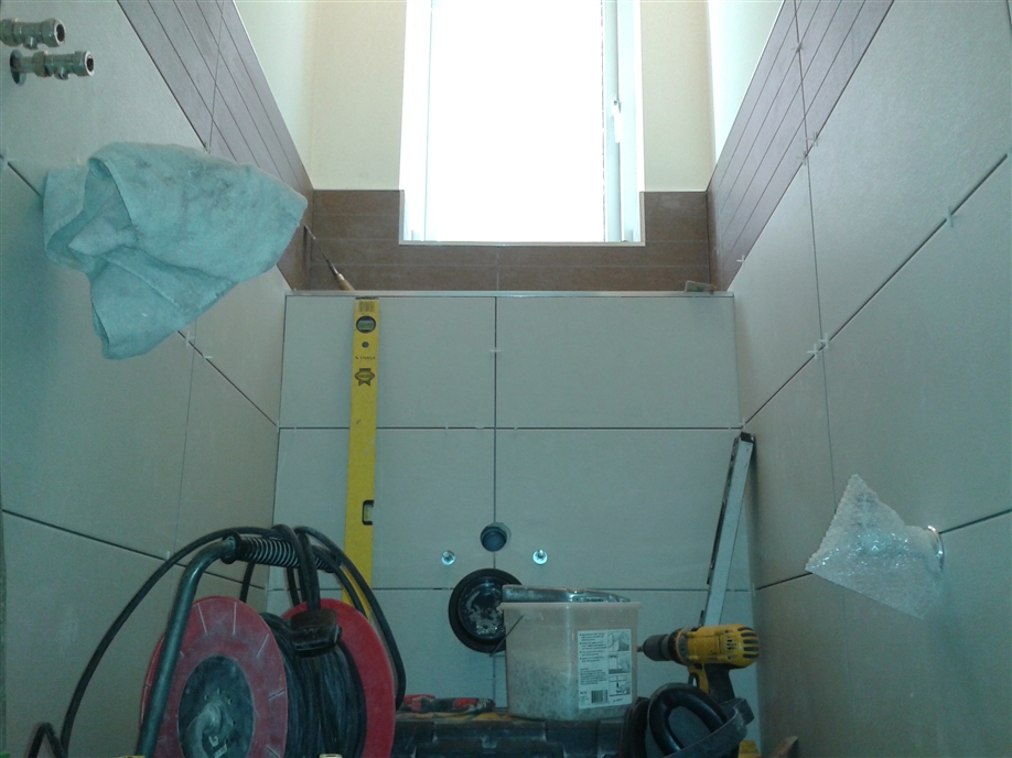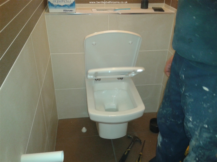 Downstairs cloakroom WC/Toilet installation including wall-hung toilet and vanity wash basin, heated towel rail/radiator, UPVC ceiling with down-lights, full walls and floor tiling, chrome taps, trims and accessories, and all associated joinery, plumbing and electrics.