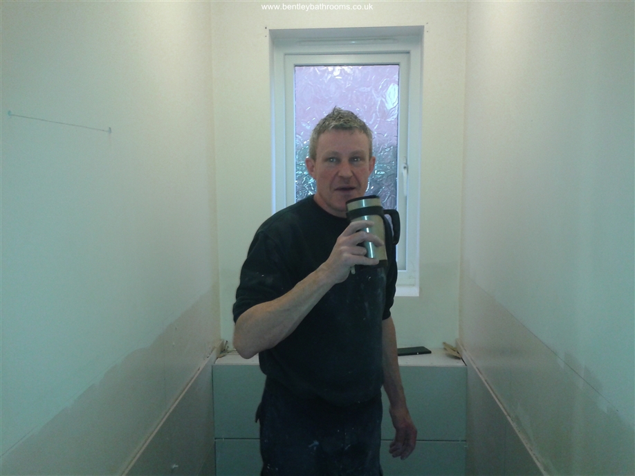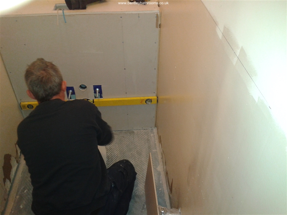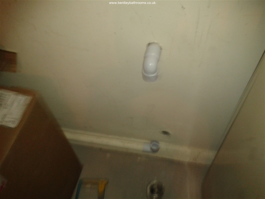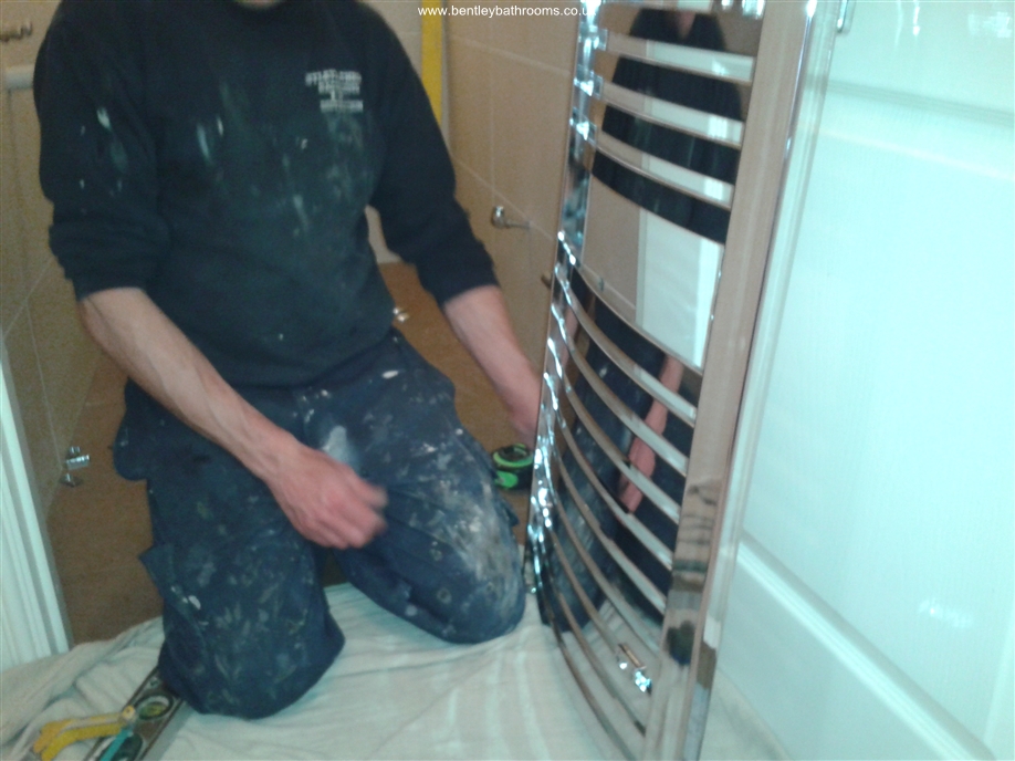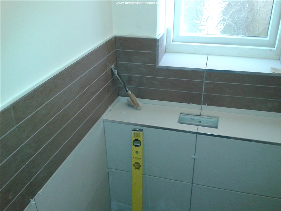 Downstairs cloakroom WC/Toilet installation including wall-hung toilet and vanity wash basin, heated towel rail/radiator, UPVC ceiling with down-lights, full walls and floor tiling, chrome taps, trims and accessories, and all associated joinery, plumbing and electrics.