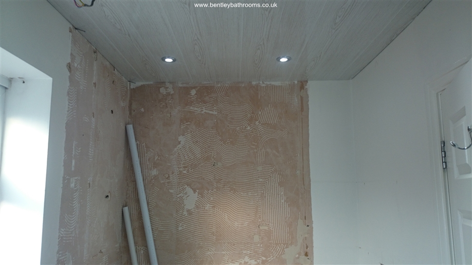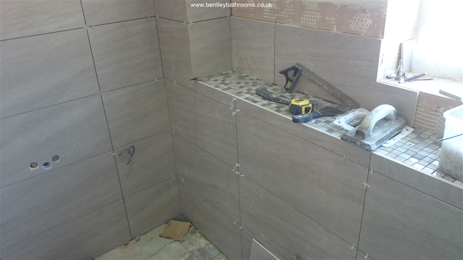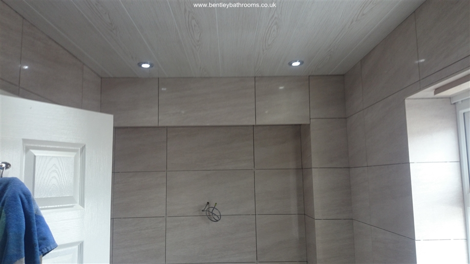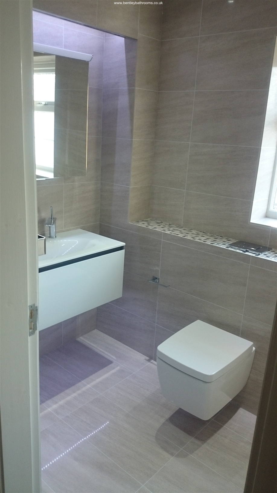 Full en-suite wet-room installation including wall-hung toilet, wall hung vanity unit and basin, bespoke mosaic tiled wet-floor/shower area, Black gloss mirrored radiator, wall and floor tiling, upvc suspended ceiling and downlights, and all associated plumbing, electrics and joinery.